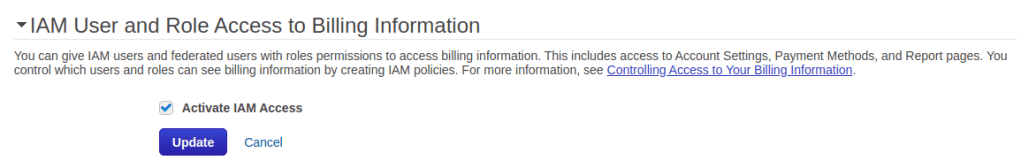 Go to your account and choose My Account. Scroll down to the section IAM User and Role Access to Billing Information, click Edit and Activate IAM Access.