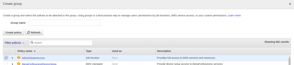 Because we do not have a Group created, we need to create an administrators group with AdministrationAccess in the next step.