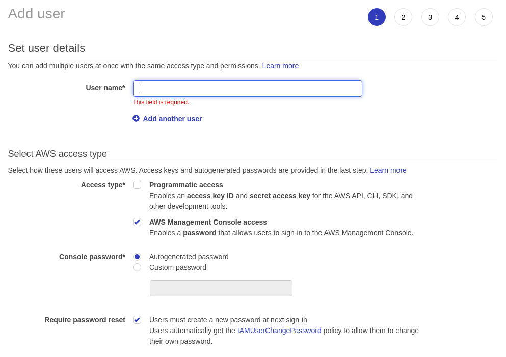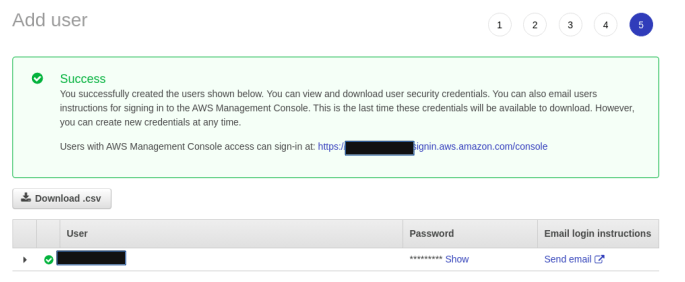 After this, a step is shown where we can add Tags, but we just skipped this step. Next, we are presented a Review page where we can review the settings of the user. In a final step, instructions are shown in order to instruct the newly created user.