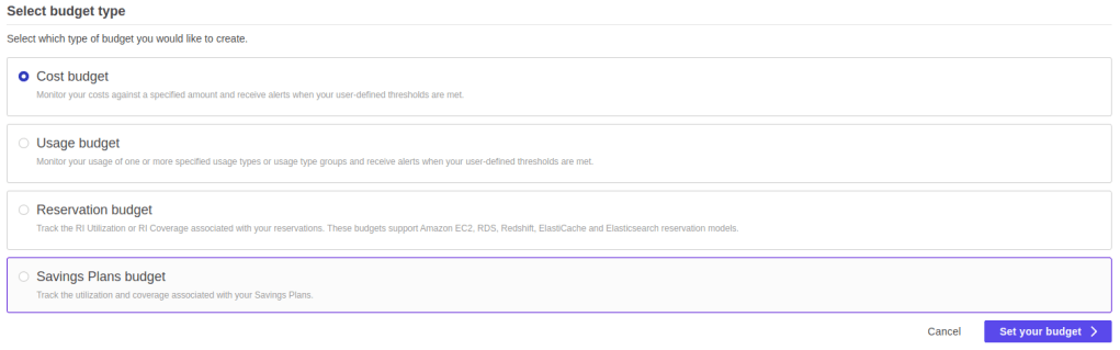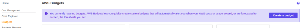 As mentioned earlier, we will set up a notification when a certain amount of money is charged. This can give you some extra comfort when you just want to experiment with AWS services and do not want to be confronted with a high bill. Go to My Account and choose My Billing Dashboard and Budgets. Click the Create a Budget button.