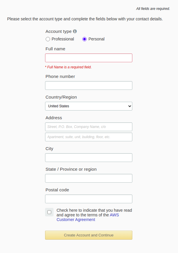 Before we can deploy or use any of the AWS services, we will need to create an AWS account. Fortunately, we can create a Free Tier account which will allow us to experiment with several AWS services. We click the Create a Free Account button and fill in our email address, a password and an AWS account name.