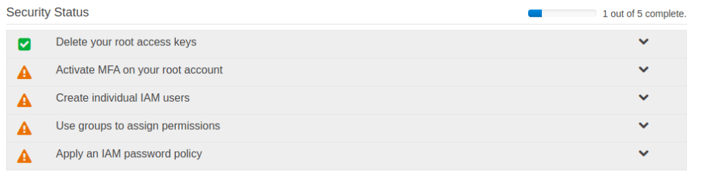 Using the Root user for your daily access and use of AWS services is not a very good idea. It is therefore advised to follow some best practices. Most of these items are shown when you navigate to the IAM Management Console Dashboard. The Security Status shows which actions need to be performed.