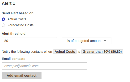 In the Configure Alerts screen, you can set a notification alert. Fill in the email contacts and click Add email contact to add the email addres. When finished, click the Confirm Budget button