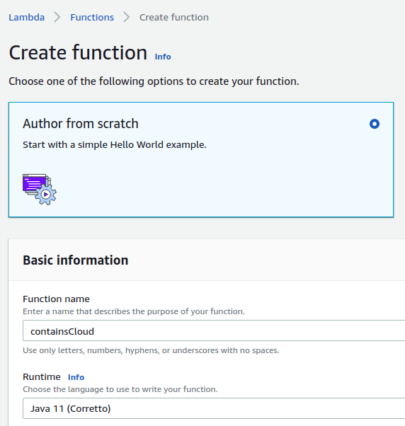 Give the function a name and select Java 11 (Corretto) as runtime and click the Create function button at the bottom right corner.