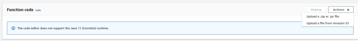 Navigate to the Function code section and choose Upload a .zip or .jar file from the Actions menu.