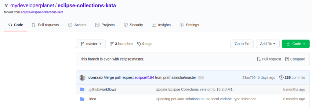 I read the blog and it gives you the handles to get started contributing to Eclipse Collections. What attracted me the most, was the availability of katas in order to get acquainted with Eclipse Collections. A kata is a Japanese word which is used for practising martial arts. It is also being used for practising your software development skills. Victor Rentea often publishes coding katas and they are impressive to look at. But the whole idea is that you execute the katas yourselves of course. Next, I took a closer look at the GitHub repository and there were enough open issues which I thought I might contribute to. But the first step was to start with the katas when I had the time for it (where did I hear that before).
