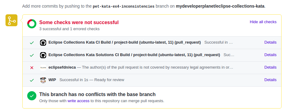 The details button referred to a login page of Eclipse Foundations. So, first I created an account. It seems that you must accept the Eclipse Contributor Agreement, which I did. Ensure that you create an account with the mail address you use for your commits. Otherwise, the check will still fail. However, after doing so, the check still failed due to the fact that we did not have a Signed-off-by footer in our commits. Sigh. I had multiple commits (keep the commits small, you know). Thus, I needed to alter the commit messages by rebasing them. First, I removed the Pull Request and deleted the remote branch. I thought it would be better to start from scratch for this one.