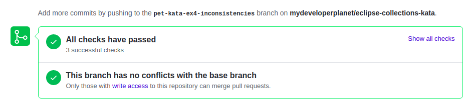 Next, I entered the amend command again, edited the next message and so on. At the end, I entered the continue rebase command in order to finish the rebase. I verified whether the commit messages had been altered correctly and pushed the branch. I created the Pull Request again and now all checks had been passed.