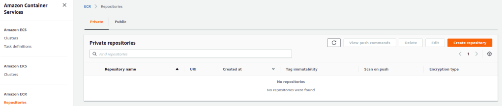 Now that you have created the Docker image, you need to upload it to ECR, the AWS Docker repository. Navigate in AWS to the ECS Service and select in the left menu the Repositories section. First thing to do, is to create a repository by clicking the Create repository button.