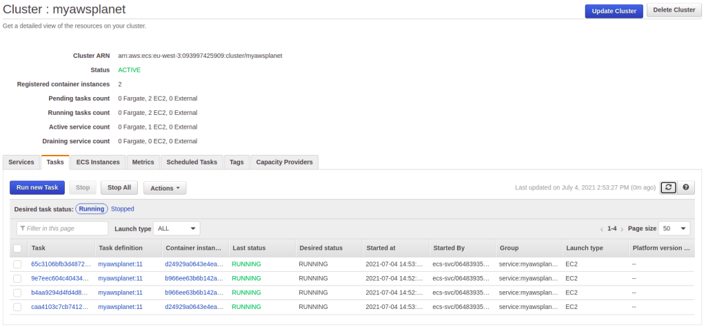In the classic view (disable the New ECS Experience toggle), you can see that 2 EC2 instances are running with each 2 tasks.