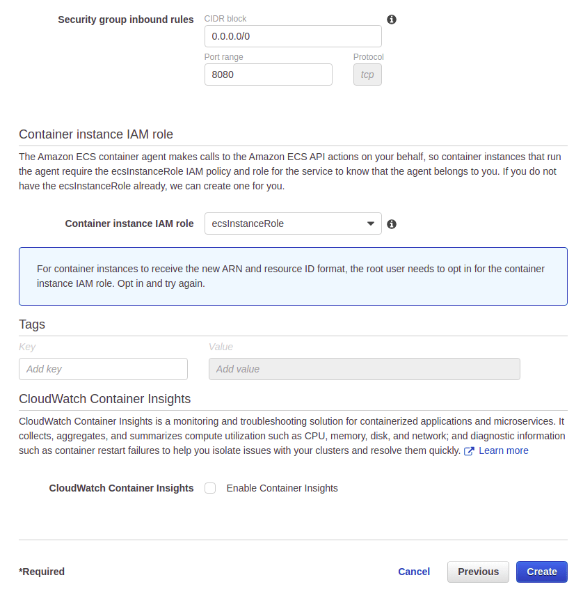 The new security group must allow all traffic for port 8080 otherwise the Rest endpoint will not be accessible. This is configured in the Security group inbound rules section. Next, choose a previously created Container instance IAM role or choose Create new role when this is the first time you are going to use this. Click the Create button.