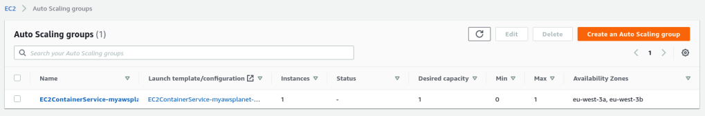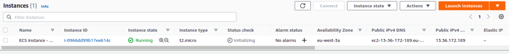 After a few minutes, the ECS Cluster is running. Navigate to the EC2 service and notice that the Auto Scaling group has been created and one EC2 instance is running.