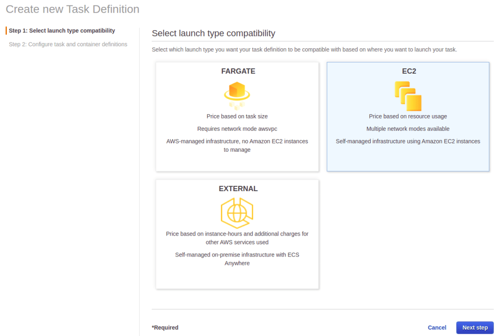 In step 1, choose for an EC2 self managed task and click the Next step button.