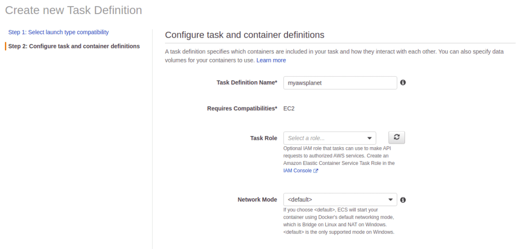 Now that the Docker image is available in ECR, next thing to do is to create a Task Definition by creating the Create new Task Definition button in the Task Definitions section (left menu).