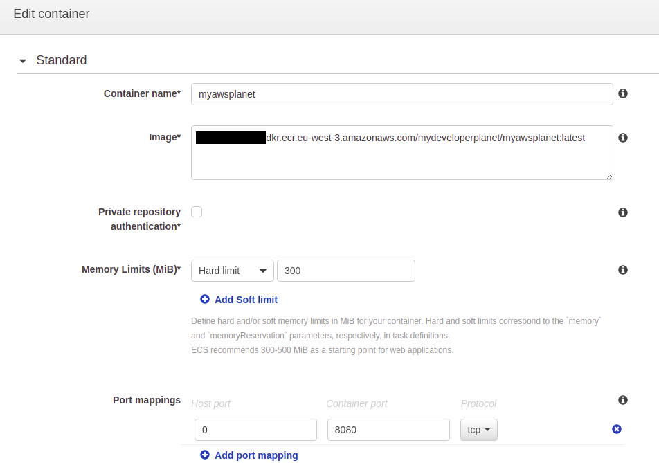 Click the Add container button. Give the container the name myawsplanet. Fill in the Image to be pulled. This should be the Image URI of the Docker image from the ECR repository followed by the tag. Set the Memory Limits to 300 and add a Port mappings entry for host port 8080 to the container port 8080 (the Spring Boot application runs on port 8080 inside the container). Finally, click the Add button in order to add the container to the Task Definition.