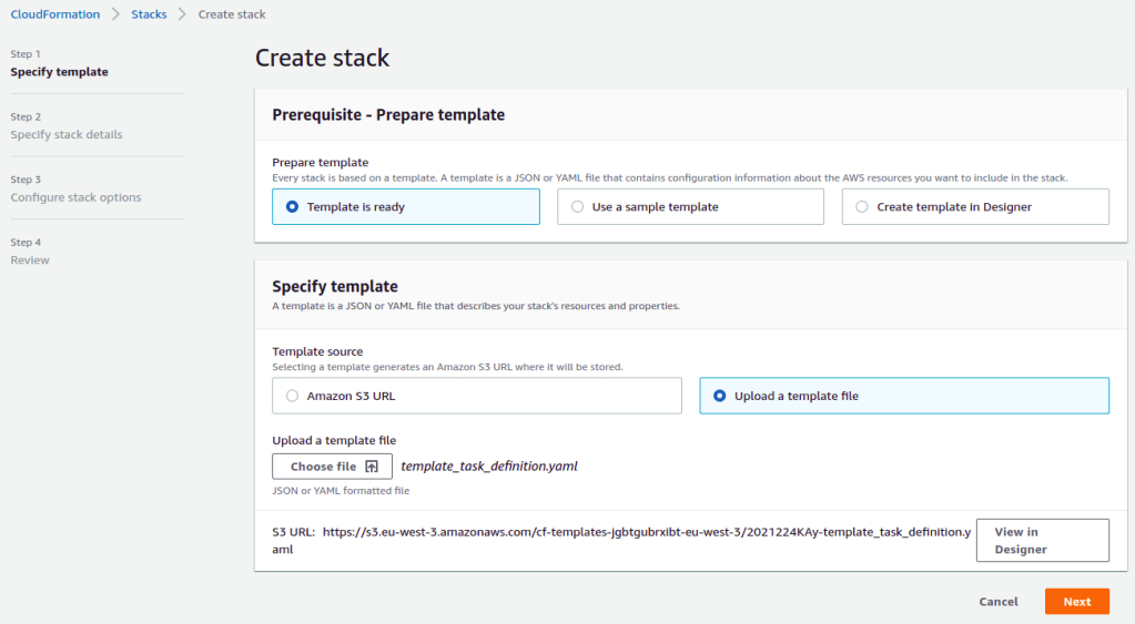 The configuration for the task definition is present in the cf_templates/template_task_definition.yaml file in the repository. The official AWS documentation for creating the Task Definition will be the main source of information. Create a task definition in the Resources section.