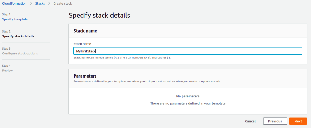 In step 2, give the stack the name MyFirstStack and click the Next button.