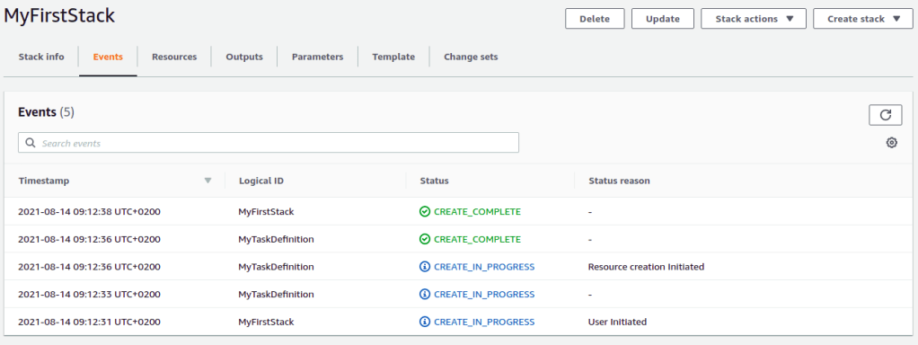 In step 3, click the Next button. In step 4, you get the opportunity for reviewing everything and when this seems ok, click the Create stack button. In the Events tab of the stack, the progress of creating the stack can be followed.