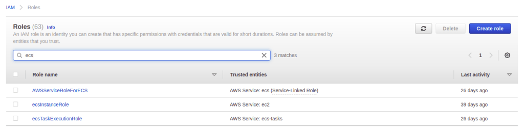 The Docker image you need to use is present in the ECR registry. In order to be able to access the registry, a task execution role is needed. This role needs to be created only once. For simplicity, it is assumed that this role already exists. If not, see the AWS documentation. Navigate to the IAM Service and choose Roles in the left menu. Search for ecs in the search bar. Click the ecsTaskExecutionRole and copy the ARN.