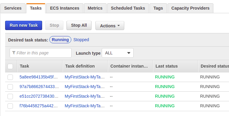 Update the stack and verify whether the ECS Service is created with 4 running tasks.