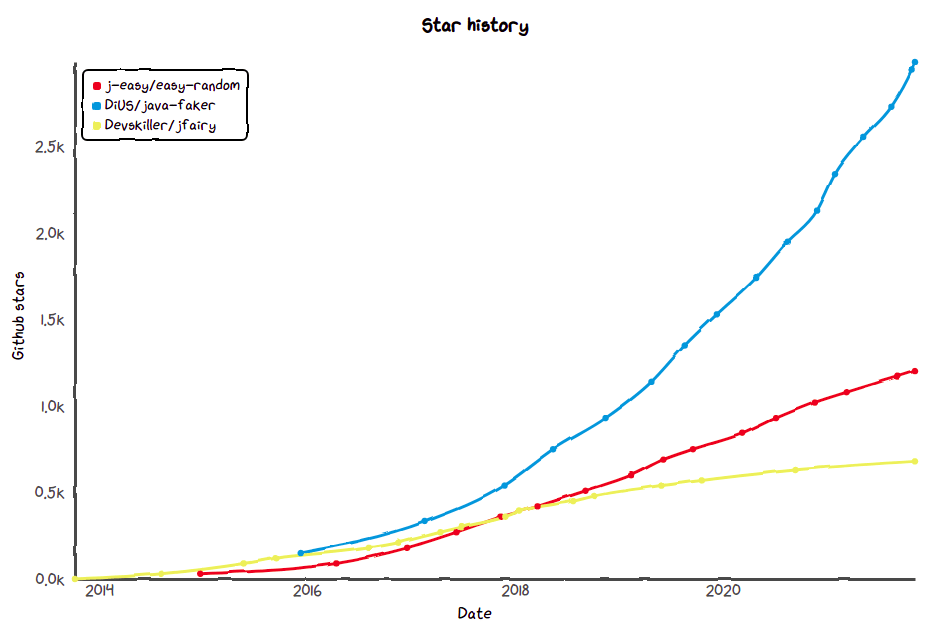 The libraries were compared in the talk and the conclusion was that Java Faker is probably the one with the most potential. Also, a comparison was shown based on the star rating on GitHub. This can easily be done with this star history website which is now in my browser bookmarks folder ;-). For the above libraries, this gives you the following result: