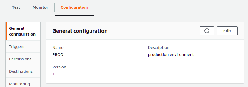 When you click a version and execute the test event, you will notice that alias DEV returns "Version 3", alias TEST returns "Version 2" and PROD returns "Version 1". And now the magic happens. Assume that you want to release version 2 to production. Navigate to the PROD alias and click the Edit button.