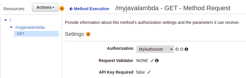 In the API Gateway, navigate to the Resources section to the GET request and click the Method Request link. Choose MyAuthorizer as Authorization setting. If it is not available as an option to choose from, refresh the page first. And do not forget to click the v-icon, otherwise the change is not saved.