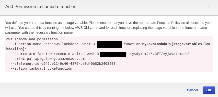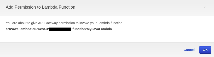 A popup window is shown for granting the API Gateway the permission to invoke your lambda function. Click the OK button in order to do so.