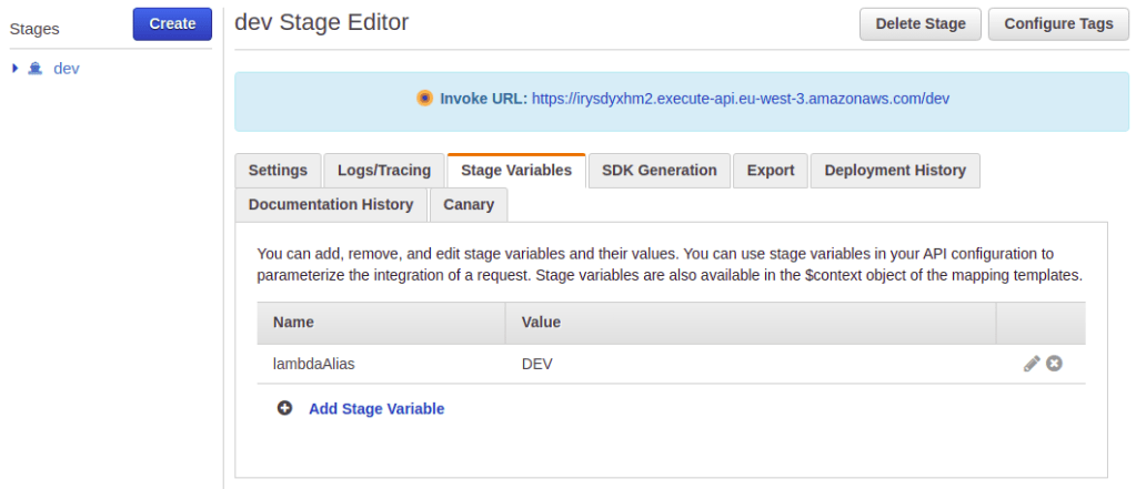 Navigate to the Stage Variables tab and add a stage variable lambdaAlias with value DEV.
