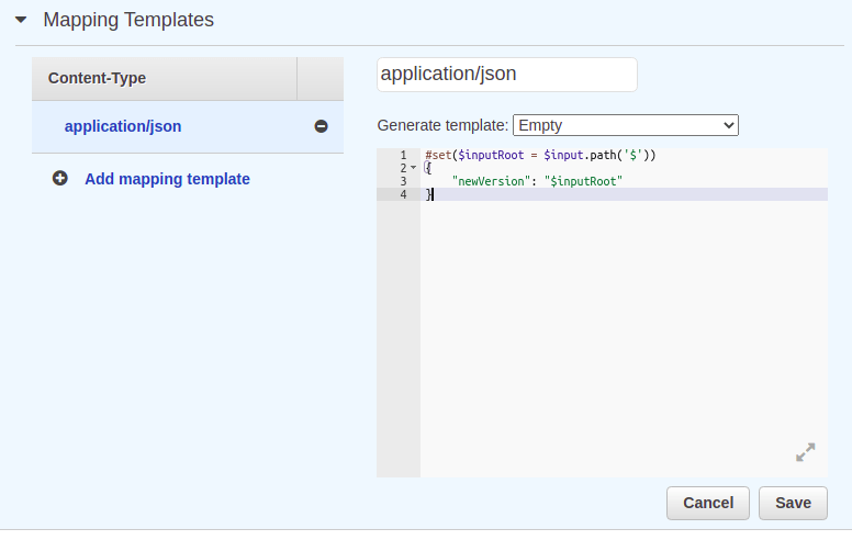 In the Mapping Templates section, leave the Content-type to the default and click application/json link.