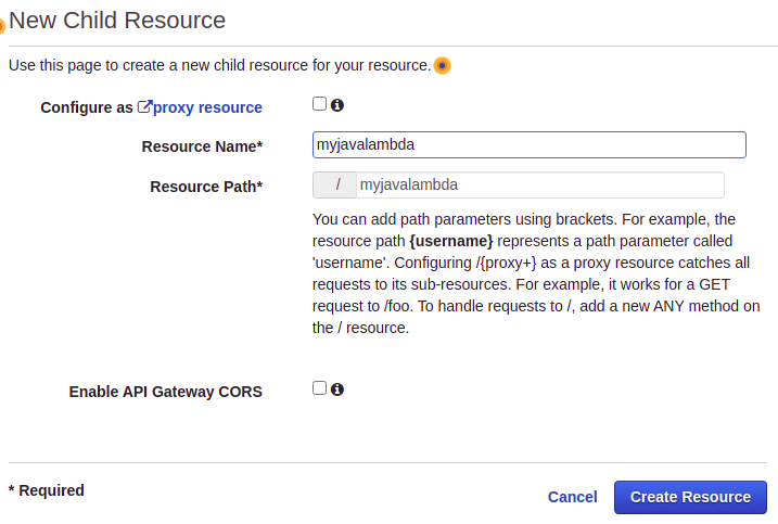 Via the Actions menu, choose Create Method and choose for a GET method. Next, enter the lambda function name MyJavaLambda in the Lambda Function field and click the Save button.