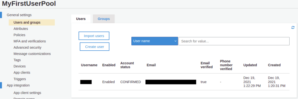 When you navigate to the Users and groups section in the left menu of the User Pool, you will notice that one user is created in this User Pool with status CONFIRMED.