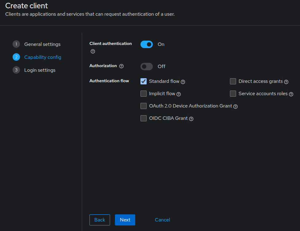 - Standard flow: is already enabled by default, leave it as is. This enables the Authorization code flow for this client.