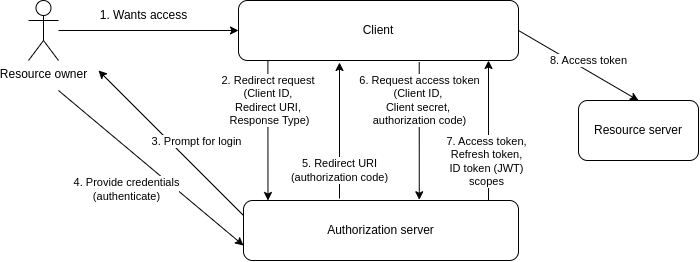 - Authorization code: a short-lived token the Client will use to exchange with the Authorization server in order to obtain an Access token.