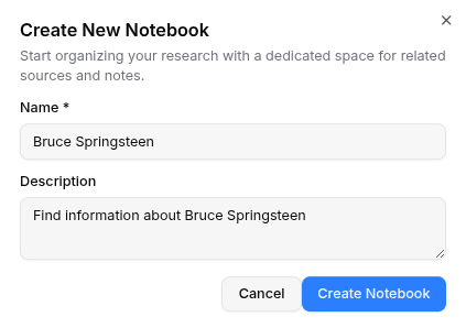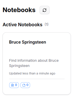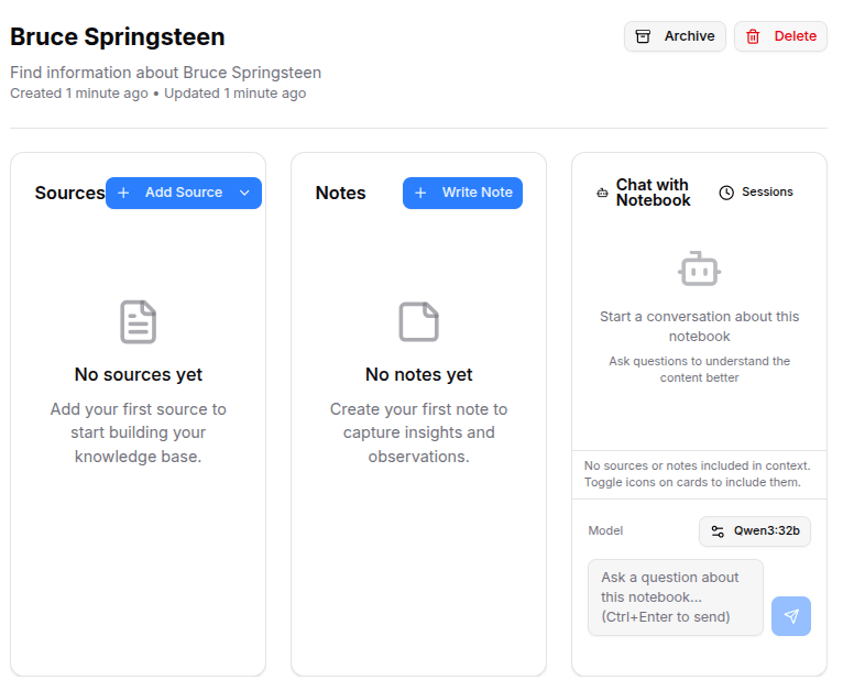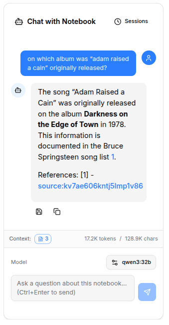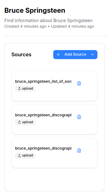 The sources used in the previous paragraph were rather small. What if a large document is added? Add a PDF version of the wikipedia page of Bruce Springsteen as a source. Processing the document takes a couple of minutes on my machine.