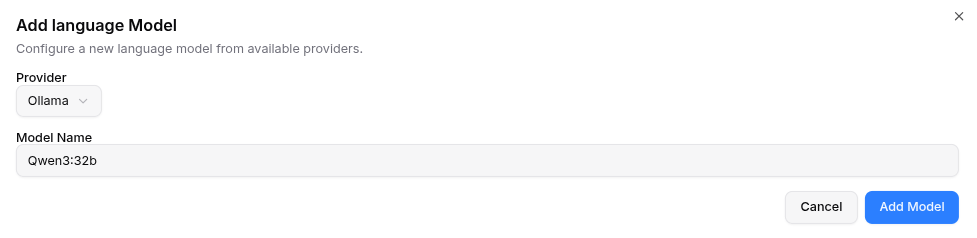 Add a model. First choose the Provider, Ollama in this case, and then choose a model. Beware, you need to type this manually and the input is case sensitive! In the example below, Qwen3:32b is used, but you should use one of the models which are available in your Ollama instance, of course.